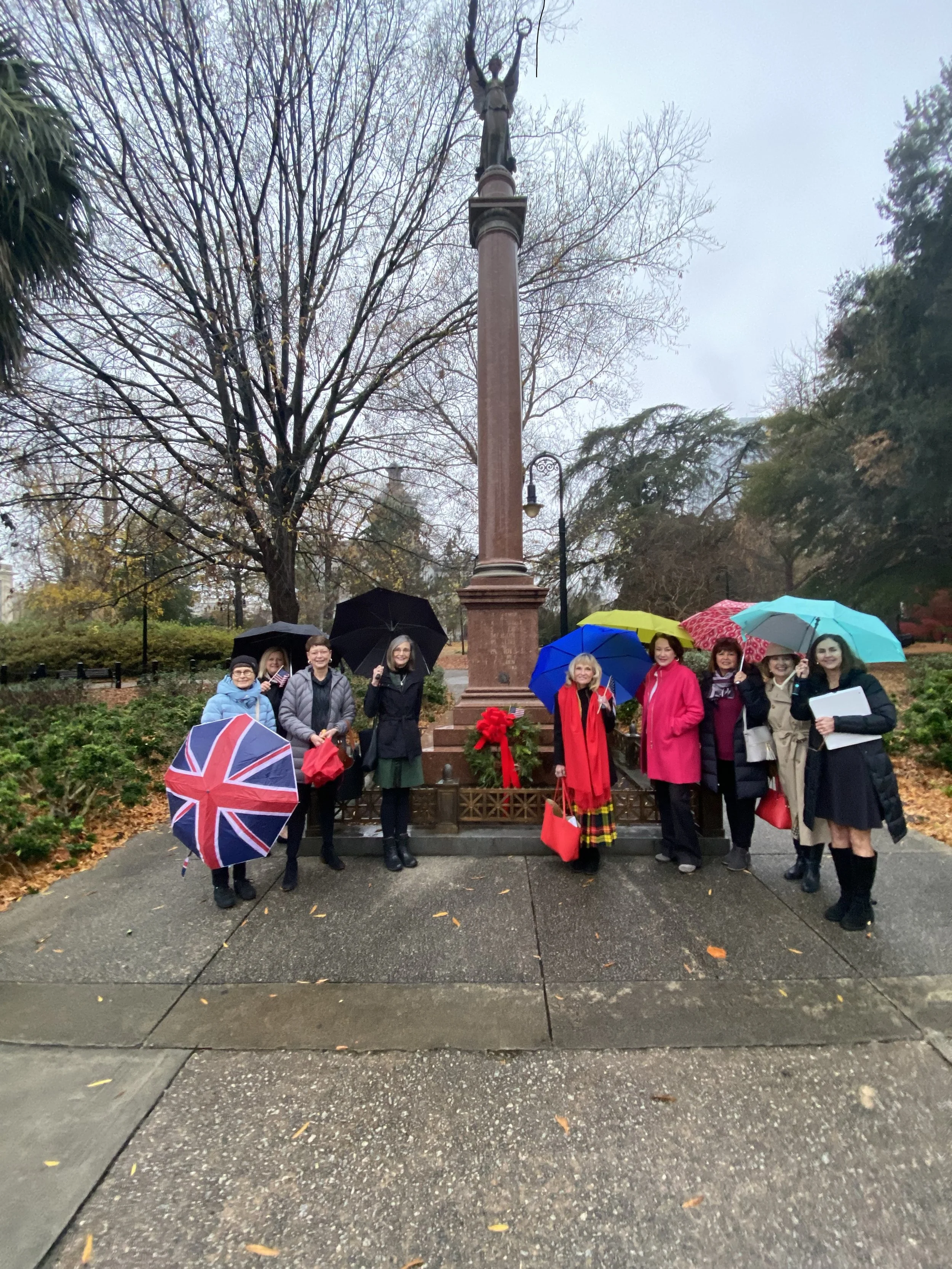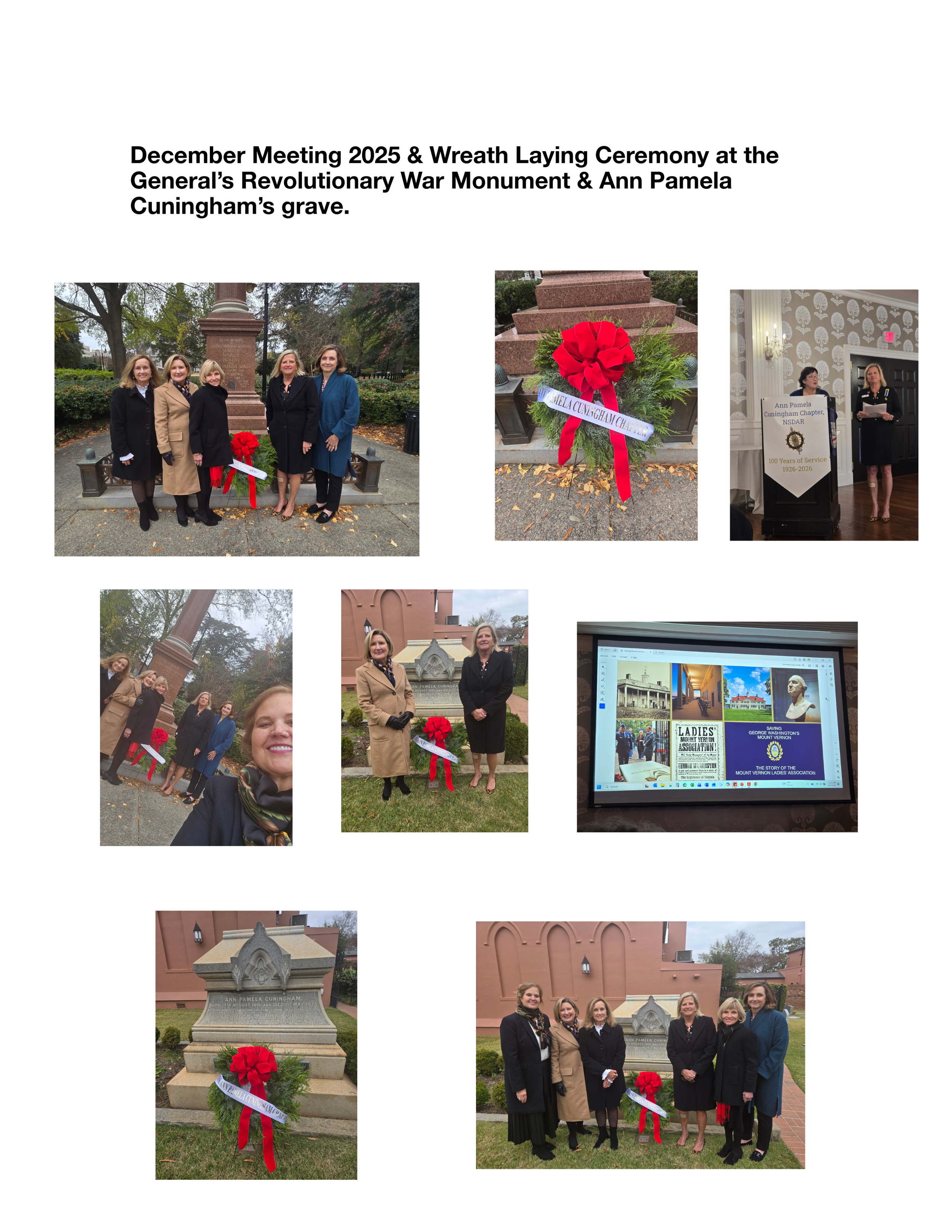 December program was a Wreath laying ceremony at Ann Pamela Cuningham’s grave on December 7th at First Presbyterian Church with chapter members. Wreath laying at the Revolutionary General’s Monument at the State House grounds followed.