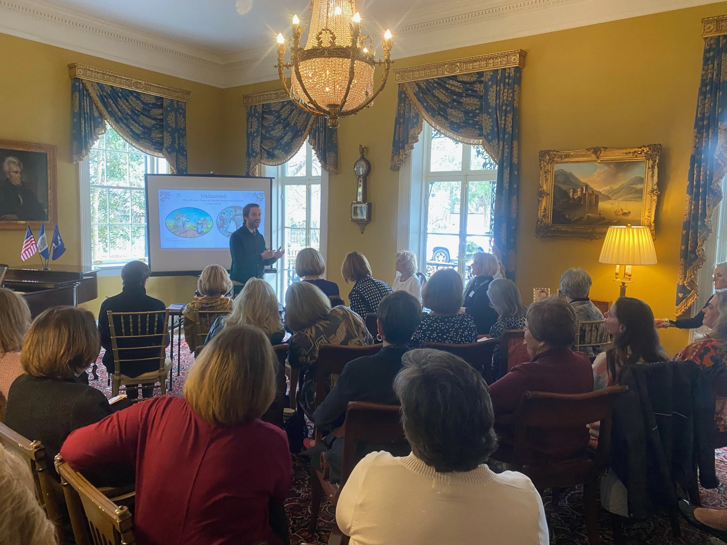 Our February meeting was held at The Governor’s mansion with guest speaker Zach Lemhouse, Staff Historian from The Culture and Heritage Museum of York Co. and Director of the Southern Revolutionary War Institute. He spoke about the remarkable Heroine and Patriot of the Revolutionary War, Martha Bratton. Our former APC Regent, Martha Chandler is named for her & is a direct descendant.