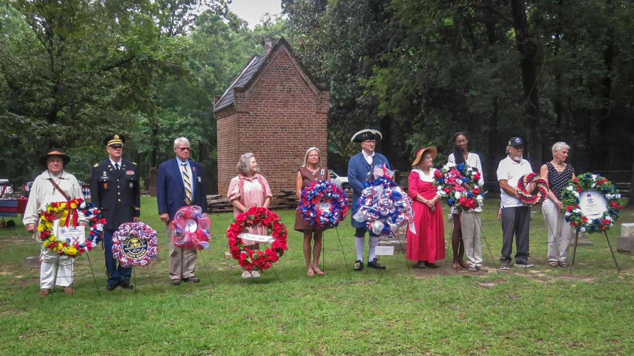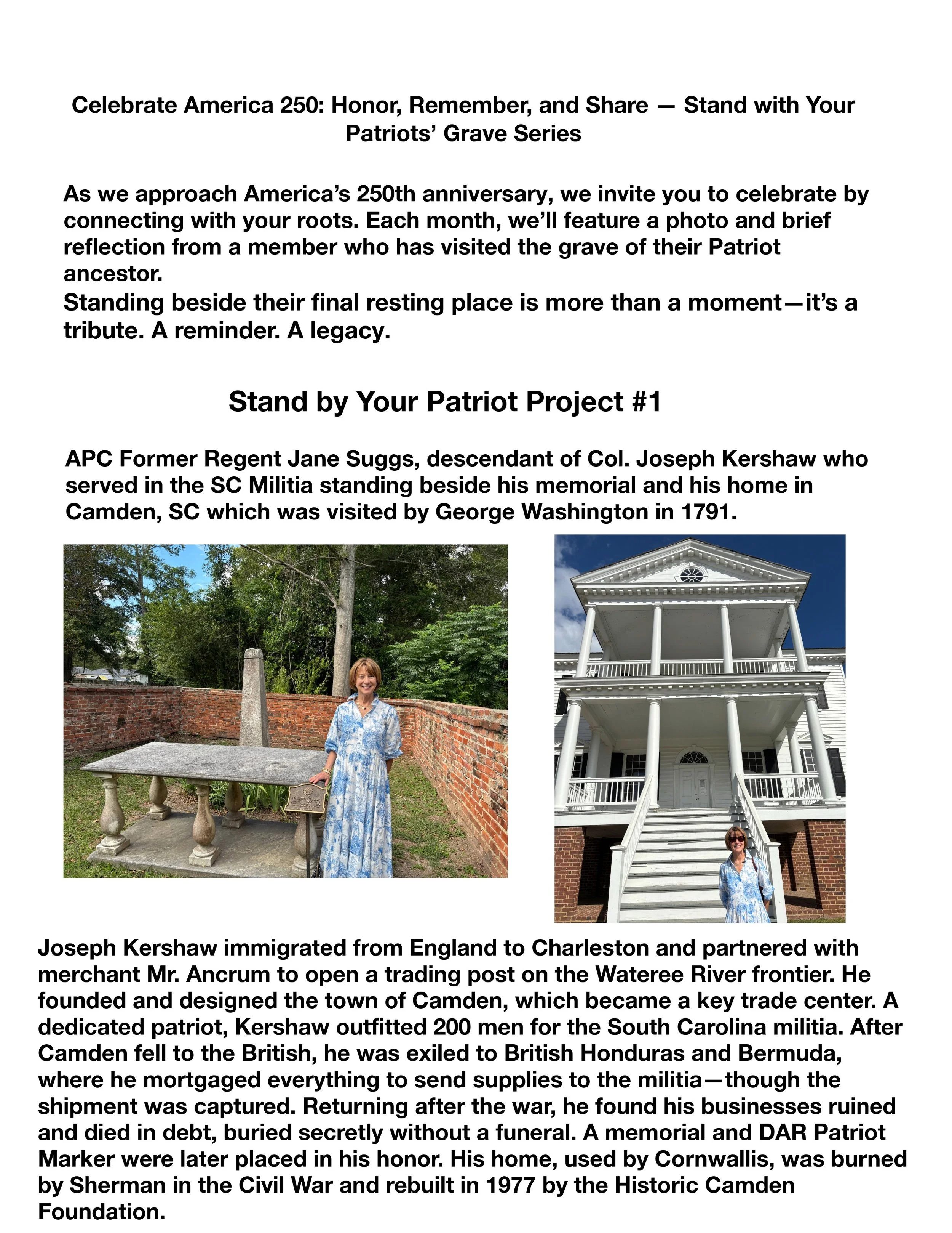 The General Thomas Sumter Commemoration was held Saturday, August 2, 2025, at the Thomas Sumter Memorial Park in Stateburg, SC. The regent presented the Ann Pamela Cuningham DAR Chapter wreath. Members of the Joseph Kershaw Chapter, Sumter’s Home Chapter along with the Ann Pamela Cuningham Chapter participated in the wreath laying. Also present were some of the descendants of Thomas Sumter.