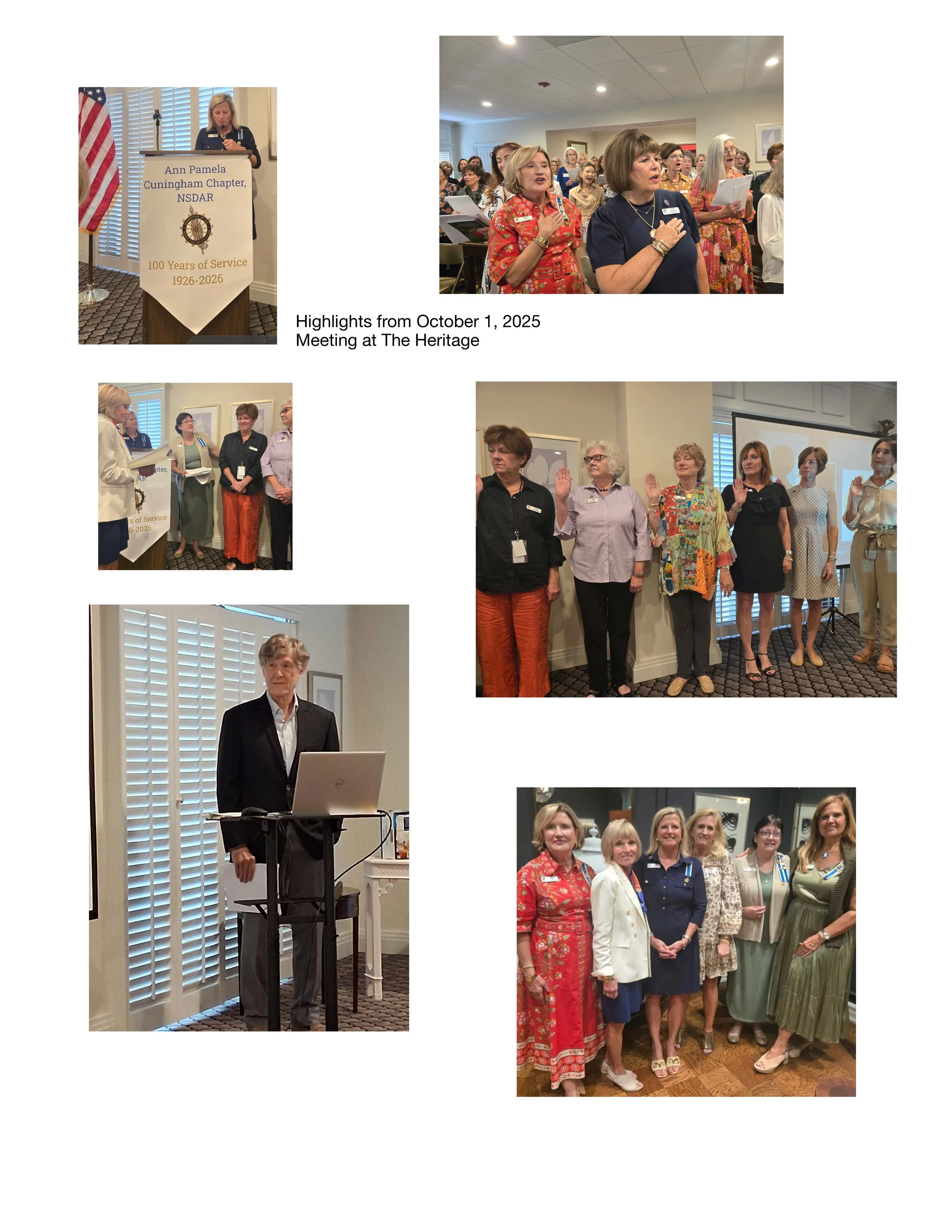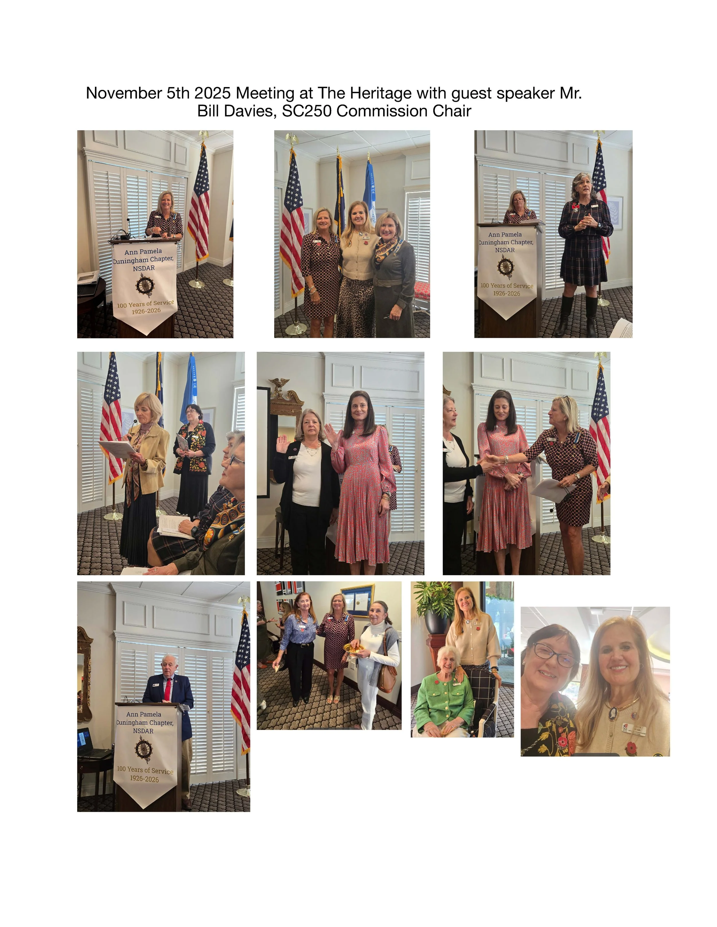 Swearing in the new officers present for 2025-2027 at the Spring luncheon. A delicious meal was planned with flowers on each table. The flowers were donated to one lucky lady at each table that had a flag sticker on her chair. A lively discussion was given about the prisoner in exile during the British occupancy at Charleston during the Revolutionary War.