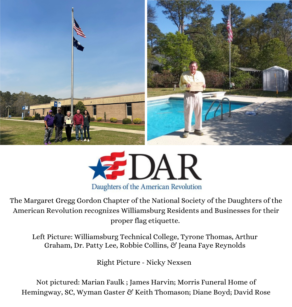 Our chapter members are involved in our community by educating the public on the proper flying of the flag by giving out information as well as honoring locals with NSDAR Flag Certificates throughout Williamsburg County for flying the Stars and Stripes on their homes and businesses.